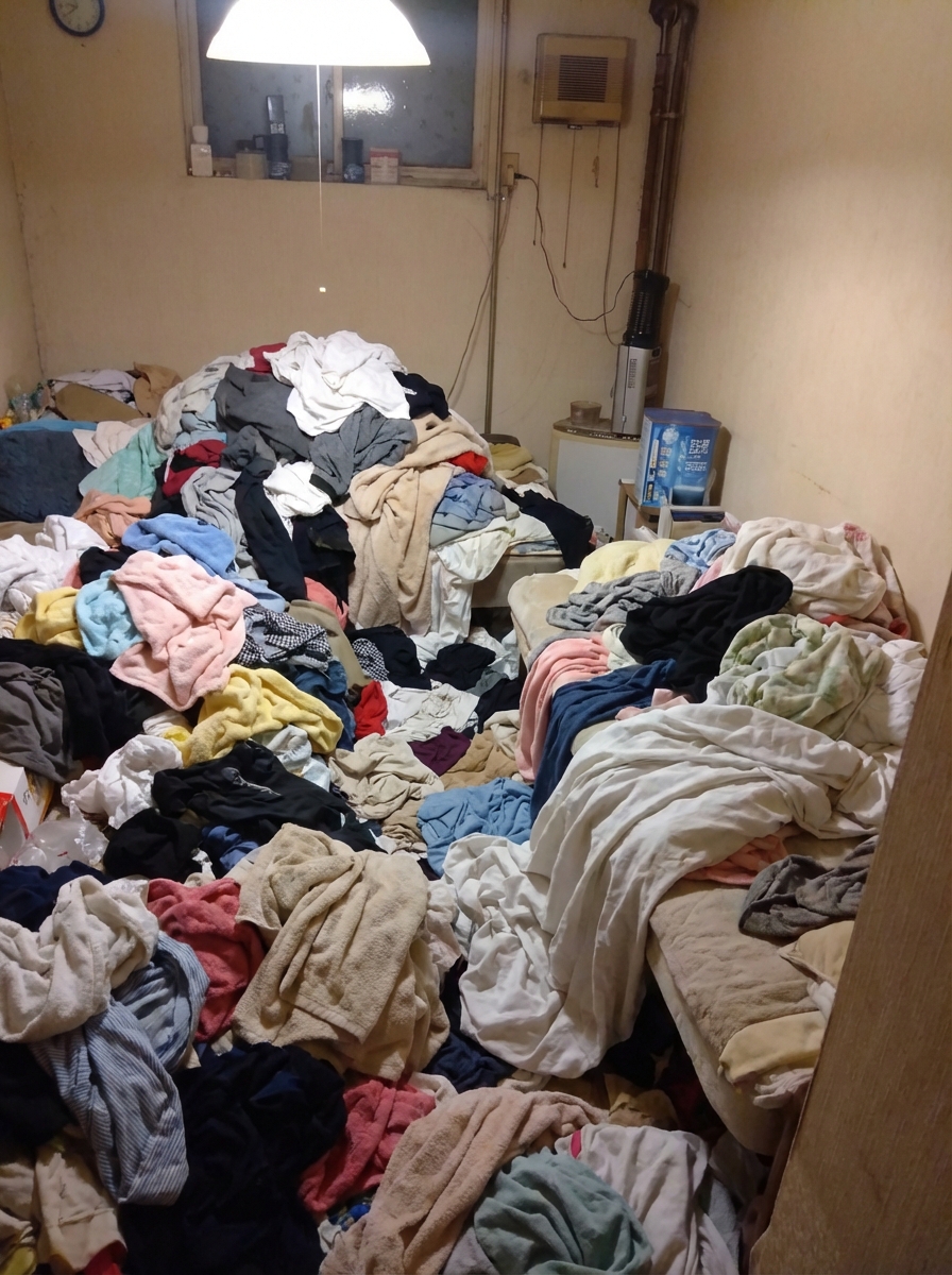 仕事が忙しく、1Kに書類と衣類が積み重なっていました