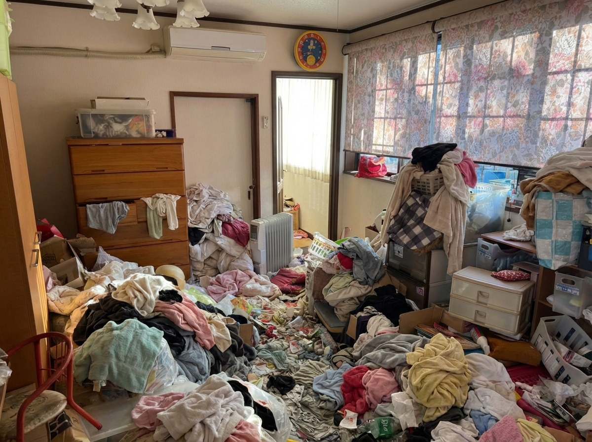 長男が結婚して家を出たのを機に、夫婦で暮らす2LDKの部屋を整理しようと思いました。何十年も溜め込んだ衣類や日用品がどの部屋にもあり、どこから始めたらいいか途方に暮れていました。スタッフの方が丁寧に分別方法を説明してくれたおかげで、スムーズに進みました。使える物は買取に出してもらい、思ったより費用も抑えられて助かりました。