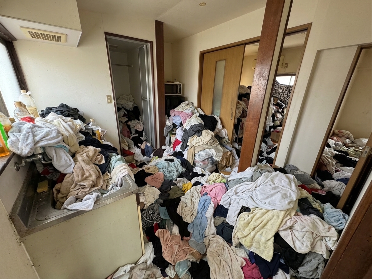 三種町内でも女性スタッフによる汚部屋清掃が可能です。下着類や生理用品が散乱している状態でも、女性スタッフが丁寧に片付けいたします。プライバシーを最優先に考え、秘密厳守で作業いたします。