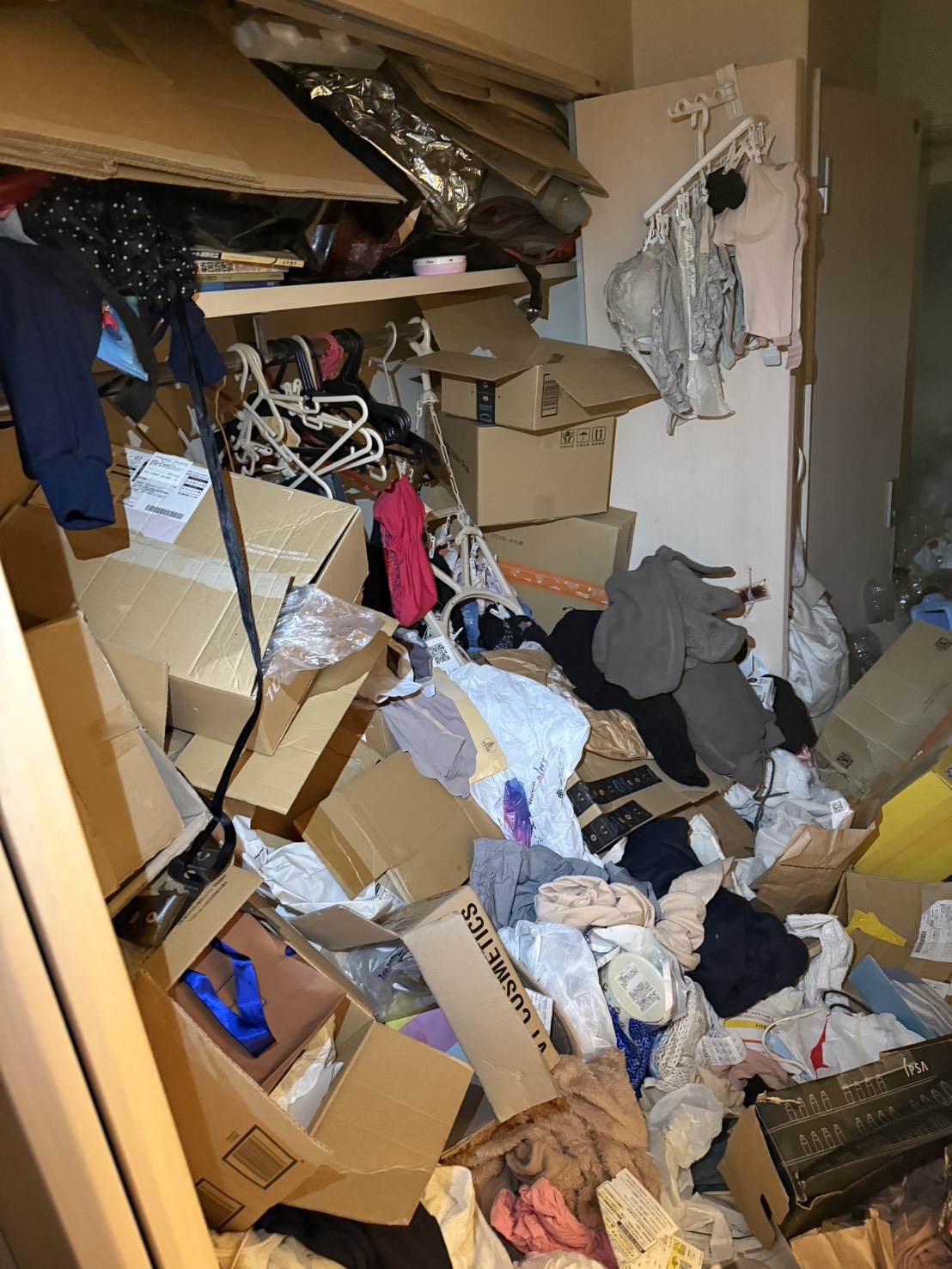 仕事が忙しく溜まった荷物で部屋が埋もれていた