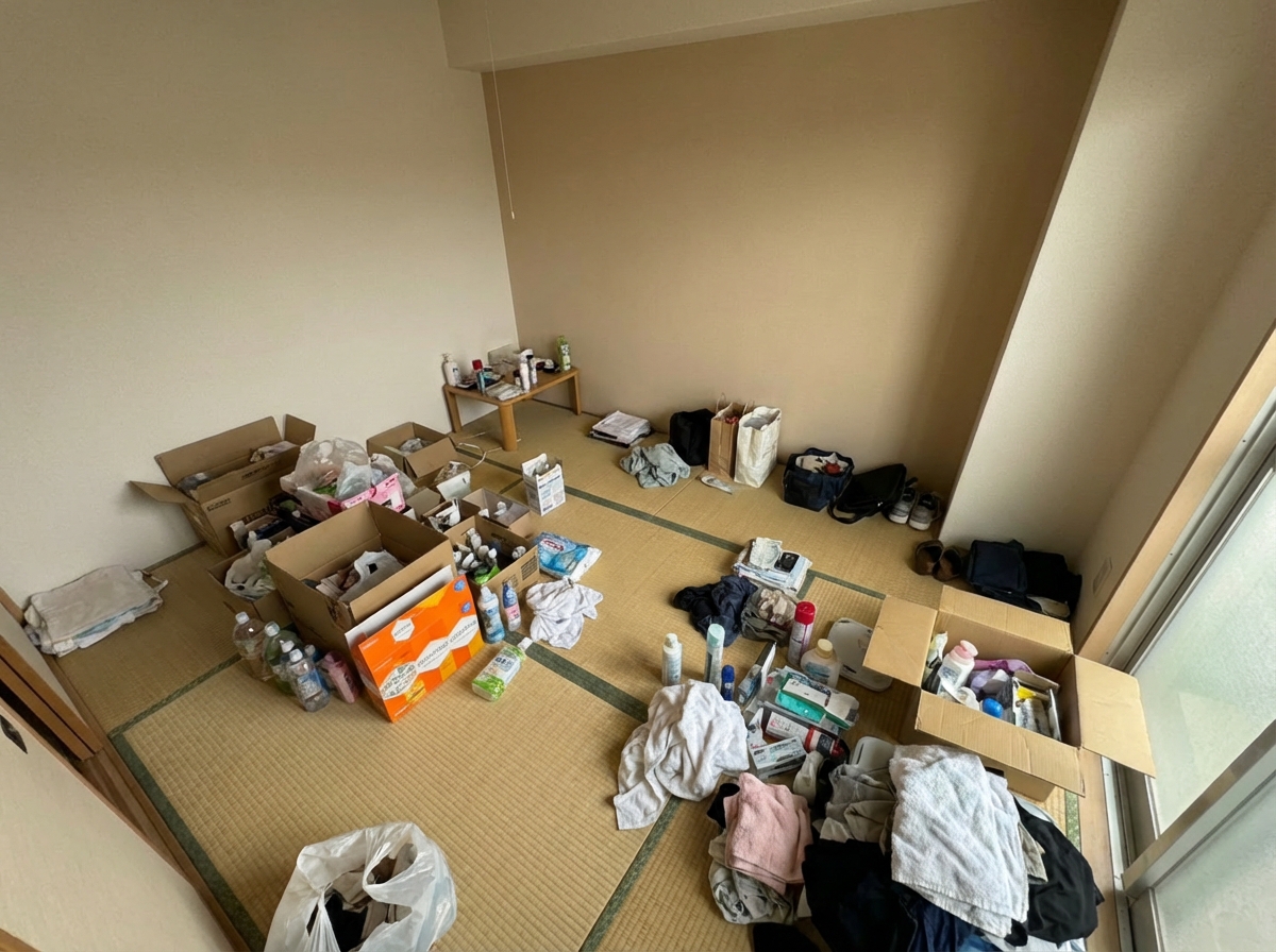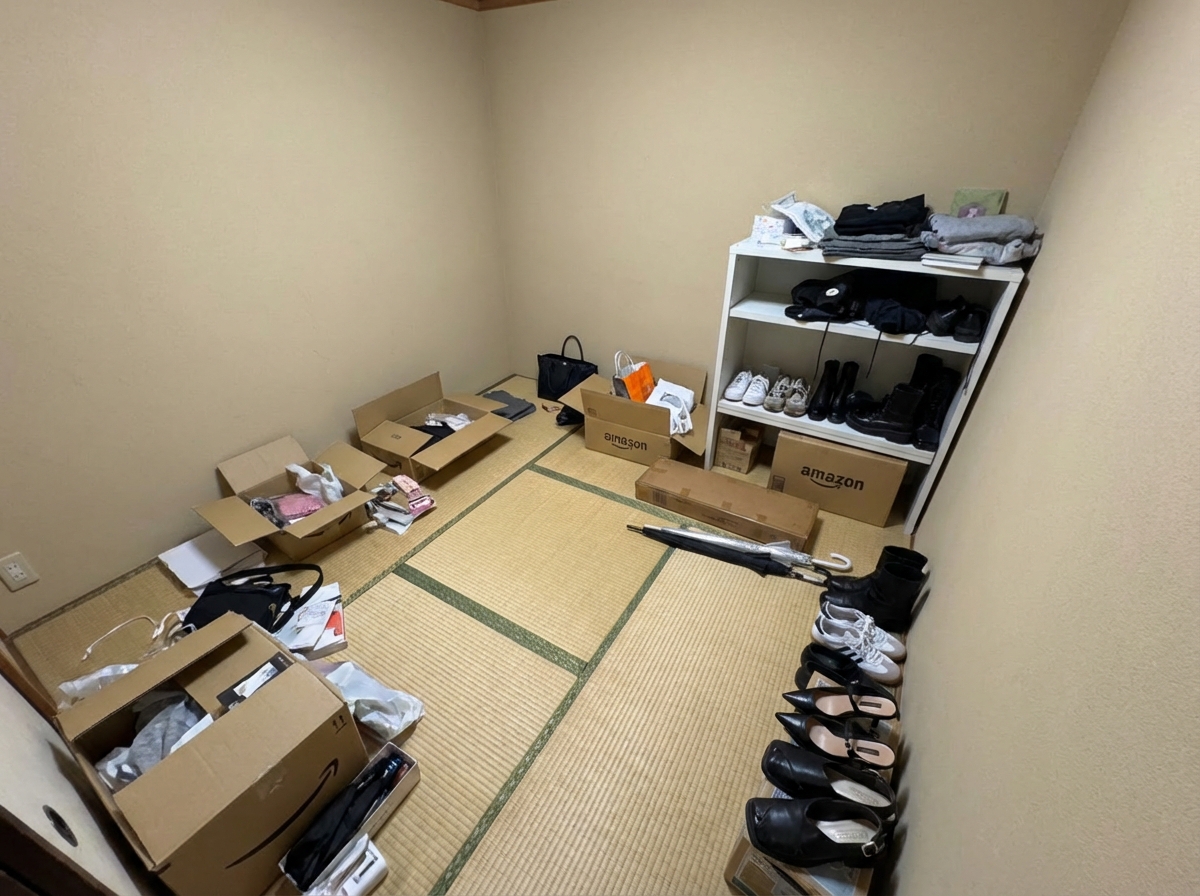 仕事が忙しく溜まった荷物が1Kに溢れてしまった